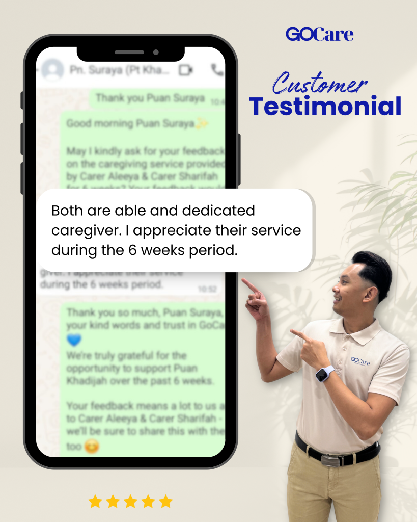 Our services are available 7 days a week and can be tailored to fit your family’s schedule. Whether it’s in-home assistance or companionship for hospital visits and social activities, GoCare makes elder care accessible and stress-free. We proudly serve families across Klang Valley including Bangi, Kajang, Putrajaya, Shah Alam, KL, and more.